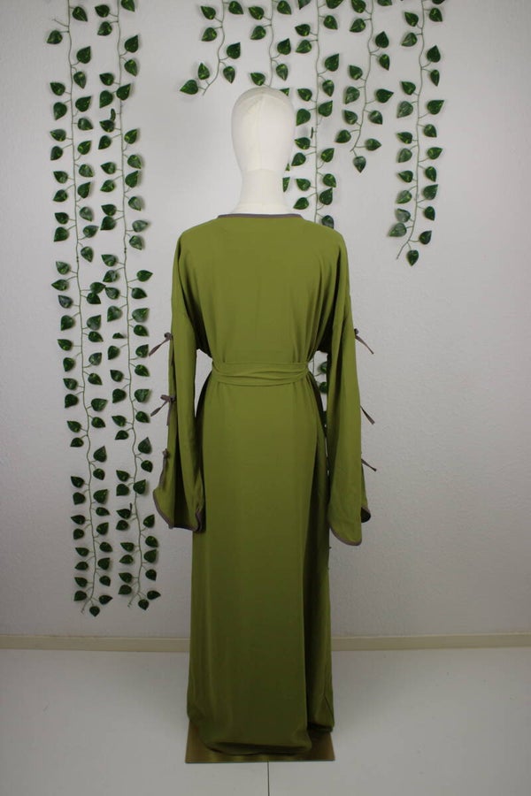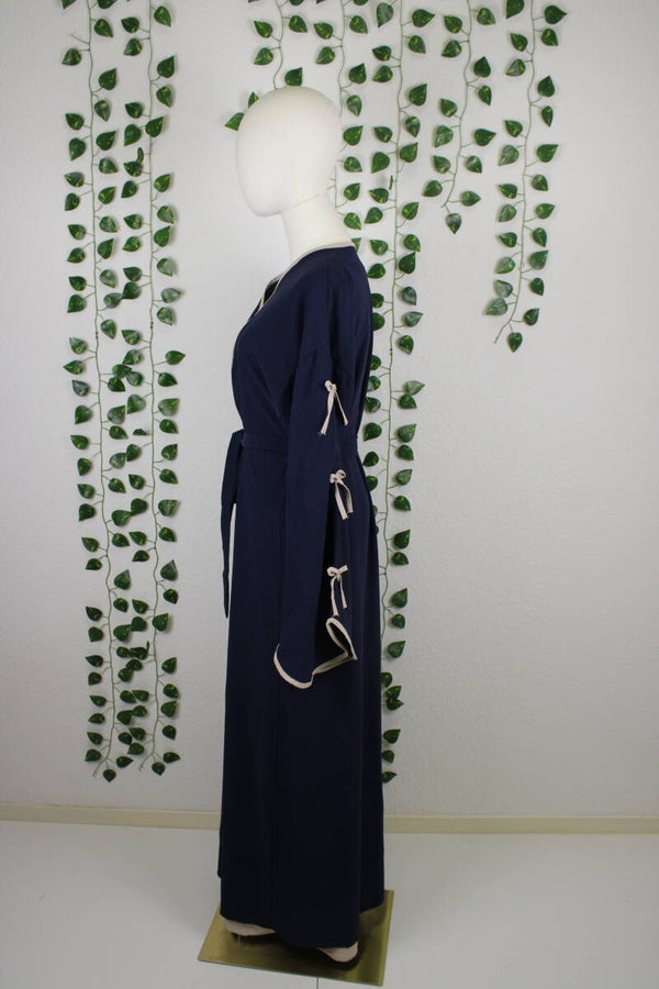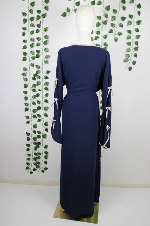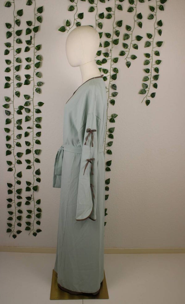 Ein Hauch von Eleganz mit liebevollen Details: Dieses zweiteilige Set besteht aus einem langen Kimono mit zarten Schleifen an den Ärmeln sowie einem passenden Unterkleid – ideal für stilvolle Auftritte im Alltag oder zu besonderen Anlässen.