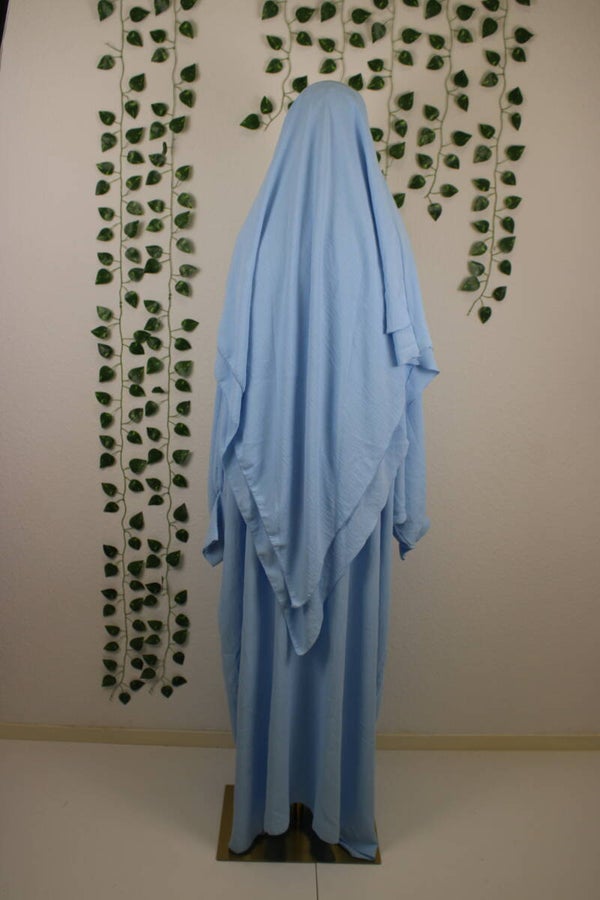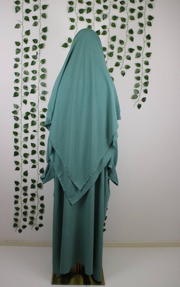 Das Carla Set kombiniert eine klassisch geschnittene Abaya mit einem stilvollen, zweilagigen Khimar. Die fließenden Stofflagen sorgen für eine elegante, sanfte Silhouette – ideal für Alltag, Gebet oder besondere Anlässe.