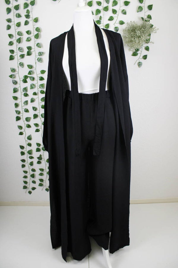 Das Haleema Set kombiniert einen fließenden, langen Kimono mit einer passenden Hose zu einem eleganten und zugleich bequemen Look. Der weite Schnitt sorgt für Bewegungsfreiheit und eine stilvolle Silhouette – perfekt für Alltag, Anlass oder Reisen.
